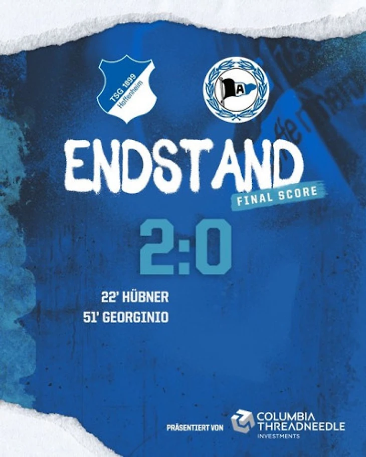 Предматчевые расклады в этой паре были не столь однозначными. У «деревенских» — 3 поражения кряду и вылет из кубка германии. У коллектива из Билефельда — 6 матчей без поражений. Однако все расклады меркнут, когда в дело вступает капитан. Беньямин Хюбнер пропустил почти 1,5 года, проводил третью игру после возвращения и буквально днях продлил контракт с «Хоффенхаймом». Нереальная заряженность капитана на игру вполне объясняет и эмоциональное празднование Беньямина после точного удара на 22-й минуте.