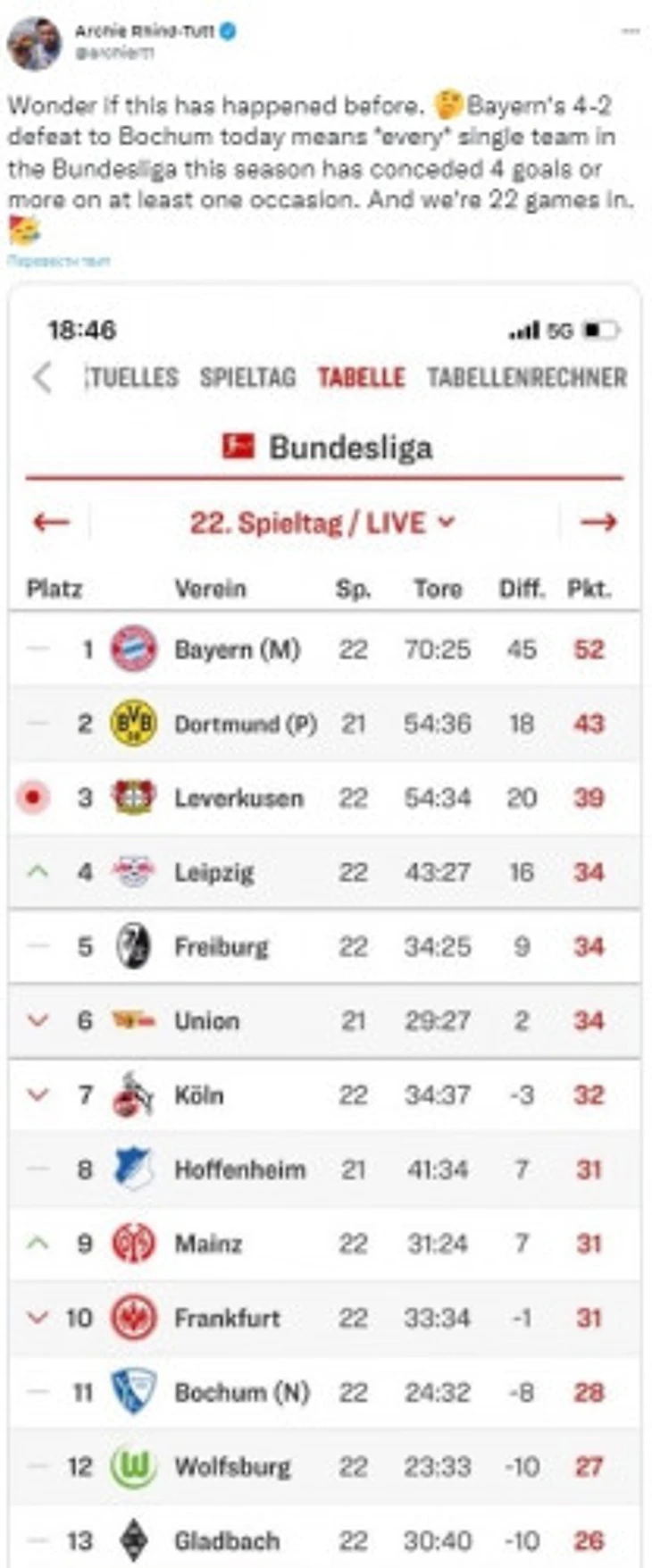 Сегодняшнее поражение «Баварии» от «Бохума» со счетом 4:2 означает, что *каждая* команда Бундеслиги в этом сезоне пропустила 4 или более мячей хотя бы один раз. И у нас 22 игры впереди).