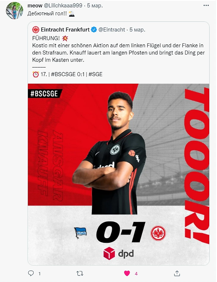 Из важных событий: первый мяч Ансгара Кнауффа за «Айнтрахт», издевательский артиллерийский гол Йеспера Линдстрёма по пустым воротам и долгожданный точный выстрел колумбийца Борре – первый за 2 месяца.
