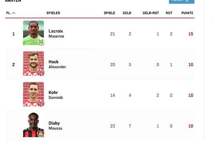 *игрок – кол-во игр – желтые – 1+1 желтые – красные – всего