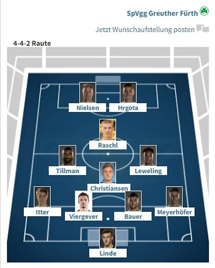 «Гройтер Фюрт»: Linde - Meyerhöfer, Bauer, Viergever, Itter - Christiansen - Seguin, Tillmann - Nielsen - Leweling, Hrgota
