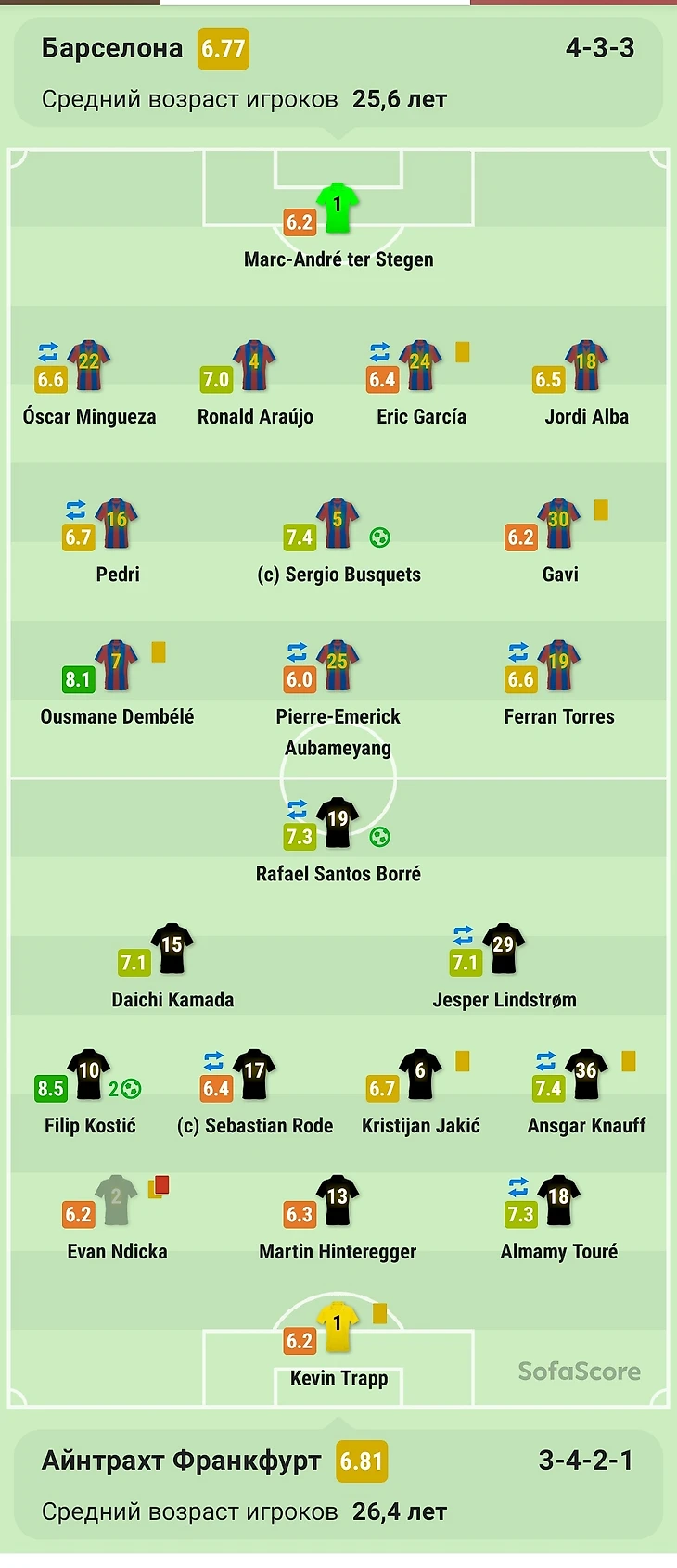 Тер Штеген, Мингеза (61’ Дест), Араухо, Эрик Гарсия (70’ Де Йонг Л.), Альба, Гави, Бускетс, Педри (46’ Де Йонг Ф), Дембеле, Обамеянг (61’ Траоре), Ферран Торрес (80’ Депай)