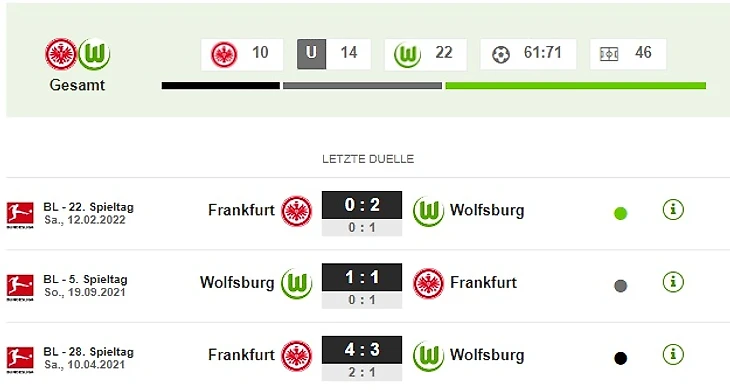 "Волки" чаще всего в Бундеслиге побеждали во Франкфурте (10 побед). Из шести предыдущих игр во Франкфурте пять завершились победами нижнесаксонцев