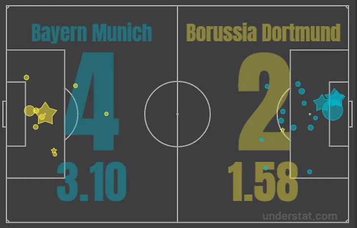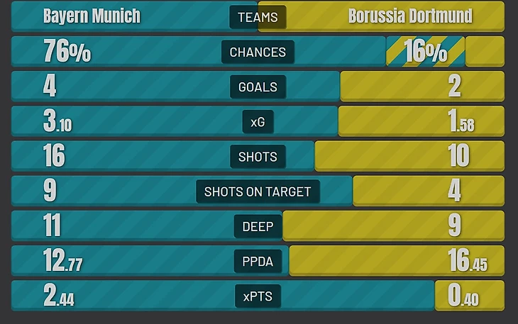 В перерыве Брандта и Рюэрсона заменили Мален и Озджан. Впрочем, это не помогло, потому что уже через пять минут Коман добился для мюнхенской команды четвертого гола. Очень красивый розыгрыш и с передачи Сане, мяч пролетел через всю штрафную на выскакивавшего Комана. На 59-й красивый гол ударом через себя забил Шупо-Мотинг, но положение вне игры лишило баварцев этого мяча. «Бавария» создала несколько отличных моментов, но общее успокоение от счета на табло привело к тому, что Гнабри сфолил на Беллингеме и Джан реализовал пенальти. Однако, психологического преимущества и мотивации для того, чтобы вернуться в игру дортмундцы в этом не нашли. Очевидный офсайд лишил Гнабри гола на 85-й минуте. Команды совсем бросили играть в концовке встречи. На 90-й минуте Дортмунд организовал розыгрышем свой второй гол. Матч закончился победой «Баварии» со счетом 4:2 и триумфальным возвращением на первое место в таблице.