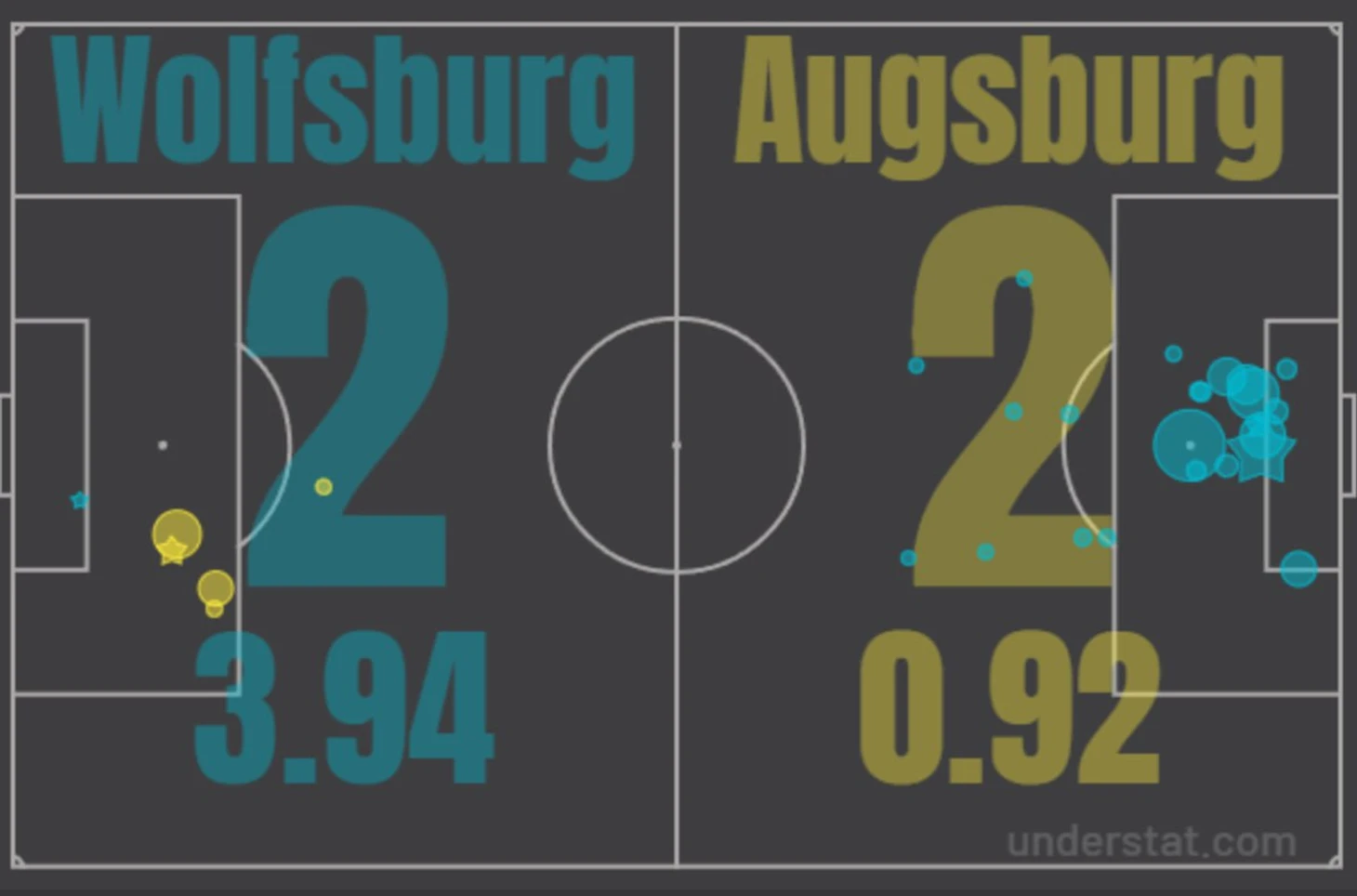 После такого скомканного начала «Вольфсбург» достаточно быстро пришел в себя и решительно продолжил встречу с явным желанием поквитаться с обидчиком. Однако и второй гол «Аугсбург» записал на свой счет. Его реализовал Бериша, отправив мяч буквально с 11 метров точно в ворота. Кстати, вероятность его попадания была всего 9%.