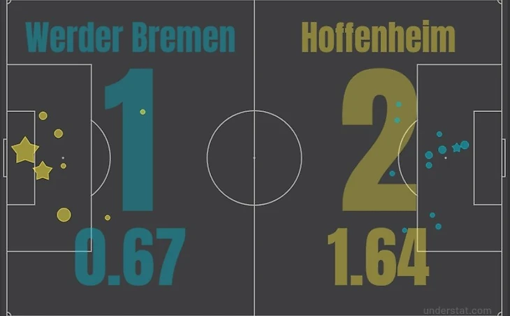 На 75-й минуте хозяева отыграли один мяч, Пипер получил точный пас от Вайзера. «Вердер» шел к этому голу, методично подбираясь к штрафной гостей. Подопечные Матараццо совсем перестали атаковать, что в играх с бременцами является плохой идеей. На последней компенсированной минуте Кабак сыграл рукой в штрафной, но Вайзер был в офсайде за мгновение до этого. Поэтому ни желтой Кабаку, ни пенальти для «Вердера» не получилось. «Хоффенхайм» выиграл второй матч подряд и стал ближе к спасению.