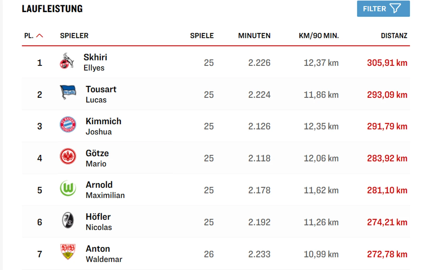 *игрок – кол-во игр – кол-во минут – в среднем км за 90 мин – всего км