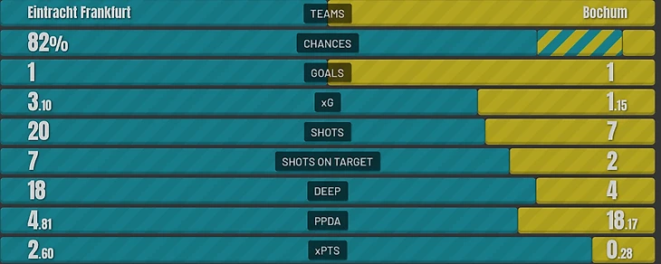 В дальнейшем «Айнтрахт» доминировал. Франкфуртцы за весь матч провели 29 ударов (против 7 у гостей), наиграв на 2,45 ожидаемых голов без учета забитого пенальти. Безумное расточительство «орлов» могло быть наказано на 72-й минуте, когда Штегер выстрелом со стандарта попал в перекладину – хотя Трапп все контролировал.