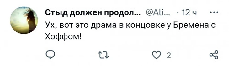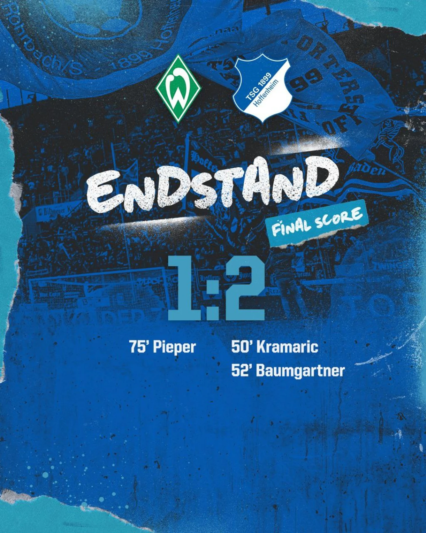 Второй тайм начался живее, «Вердер» провел атаку, однако ответ «Хоффенхайма» оказался мощнее. Разыграв мяч в центре, гости подошли к штрафной, с фланга от Анхелиньо классная подача достигла Крамарича – мяч в сетке. И второй гол буквально пару минут спустя Баумгартнер забил с подачи Кадержабека.