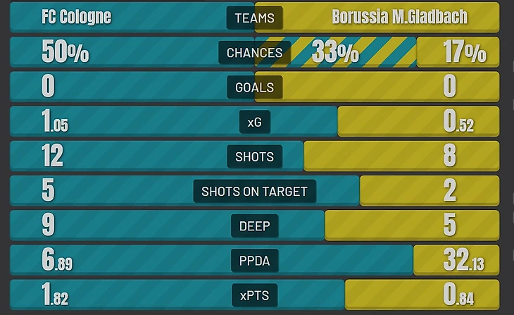 В начале второго тайма Гладбах наконец-то создал момент, но даже тут вмешался офсайд и исключил его из статистики. На вторую половину встречи гости вышли более заряженными, а Кёльн отвечал взаимностью. Начало тайма было бодрое, а вот к середине стало откровенно скучно, гол мог бы в эту игру вдохнуть жизни. Огненную концовку создать так же не получилось, хотя «Кёльн» прилично атаковал.