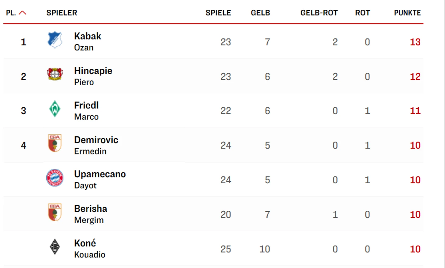 *игрок – кол-во игр – желтые – 1+1 желтые – красные – всего