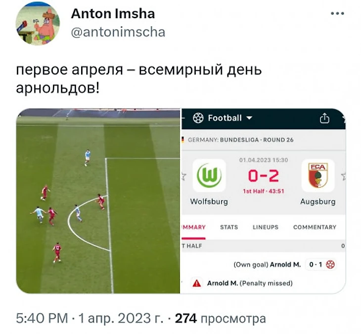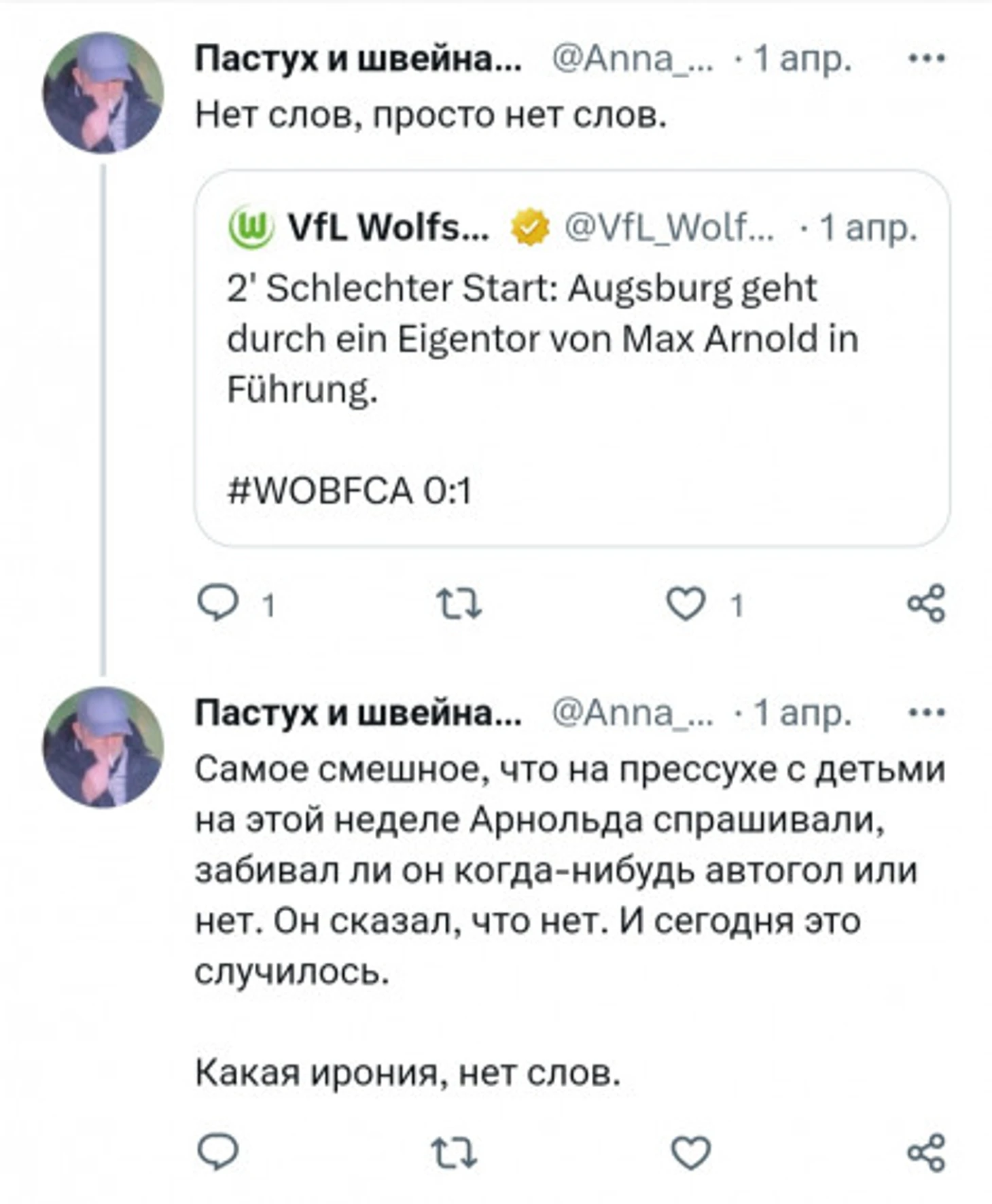 И не успели игроки размяться, как «волки» умудрились проморгать гол. На 1-й минуте матча «Аугсбургу» был назначен угловой, на который со всем рвением бросился капитан Арнольд. Вот только его вынос мяча одним мощным движением превратился в автогол. У Гикевича не было шансов спаси команду.