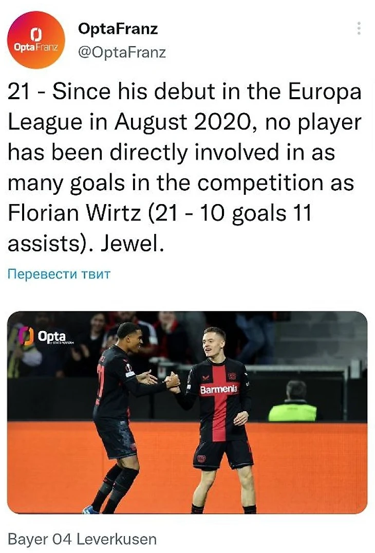 Однако дальше «Байер» было уже не остановить. Сначала Виртц оформил первую голевую передачу, войдя на дриблинге в штрафную и отпасовав на Гримальдо. Еще до перерыва мощный удар с его ассиста удался и Виктору Бонифасе — это 3:1 и преимущество в два мяча. Голевой концерт продолжился и на старте второго тайма. Третья голевая передача Виртца наряду с точным ударом Гримальдо из-за штрафной оформили разгром. А спустя еще три минуты после удара Бонифасе мяч в ворота Андрея Лунева добил Тапсоба — 5:1.