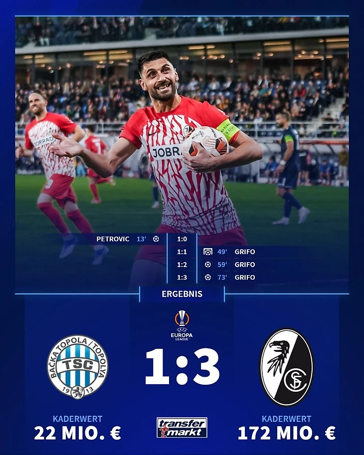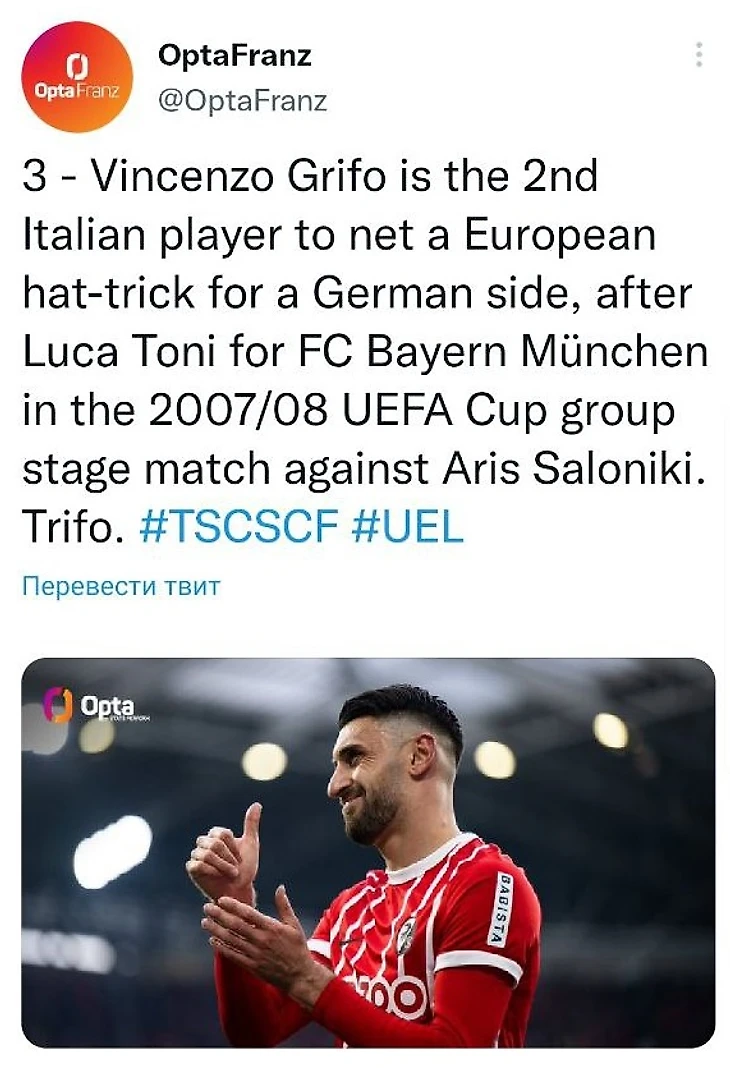 Хет-трик позволил Грифо выйти в лучшие бомбардиры турнира (вместе с Жоао Педро из «Брайтона»), у него 4 гола, а у «Фрайбурга» 6 очков и прекрасные перспективы пополнить очковый запас в ответном матче!
