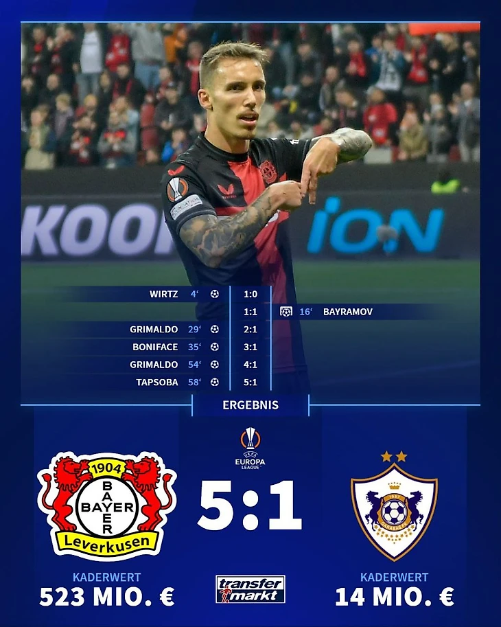 Преимущество «Байера» было колоссальным −14:1 по ударам до перерыва, 21:3 по итогам всей встречи. После пятого гола Хаби Алонсо перешел в режим экономии, начав массовые замены. Из приятного — впервые с марта вышел на поле Патрик Шик, прошедший долгое восстановление. А «Байер» в целом стал единоличным лидером в своей группе Лиге Европы, «Карабах» теперь отстает на три очка.
