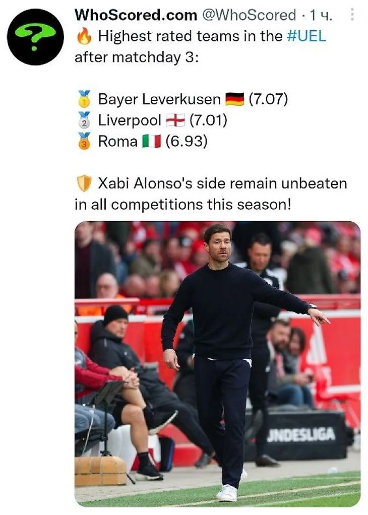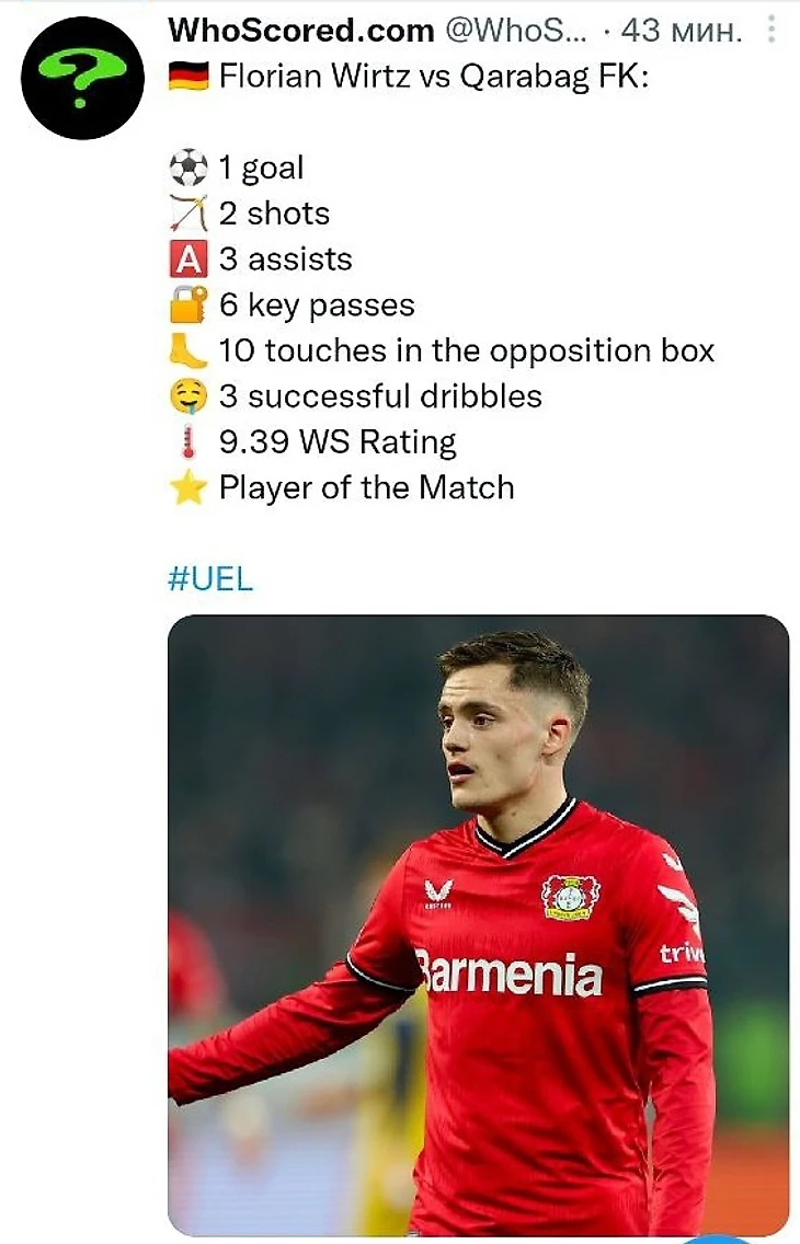 Есть ощущение, что в другие годы «Карабах» мог доставить немало проблем леверкузенцам. Азербайджанская команда любит атаковать, много владеет мячом. В послужном списке ее побед — немало солидных клубов-середняков. Сезон-2023/24 — не тот случай, чтобы говорить на равных о соперничестве с «Байером». Коллектив Хаби Алонсо ни в одном из турниров еще не терпел поражений, в Лиге Европы набрал перед поединком с «Карабахом» шесть очков из шести возможных, а в Бундеслиге идет лидером, лишь раз сыграв вничью — на выезде с «Баварией».