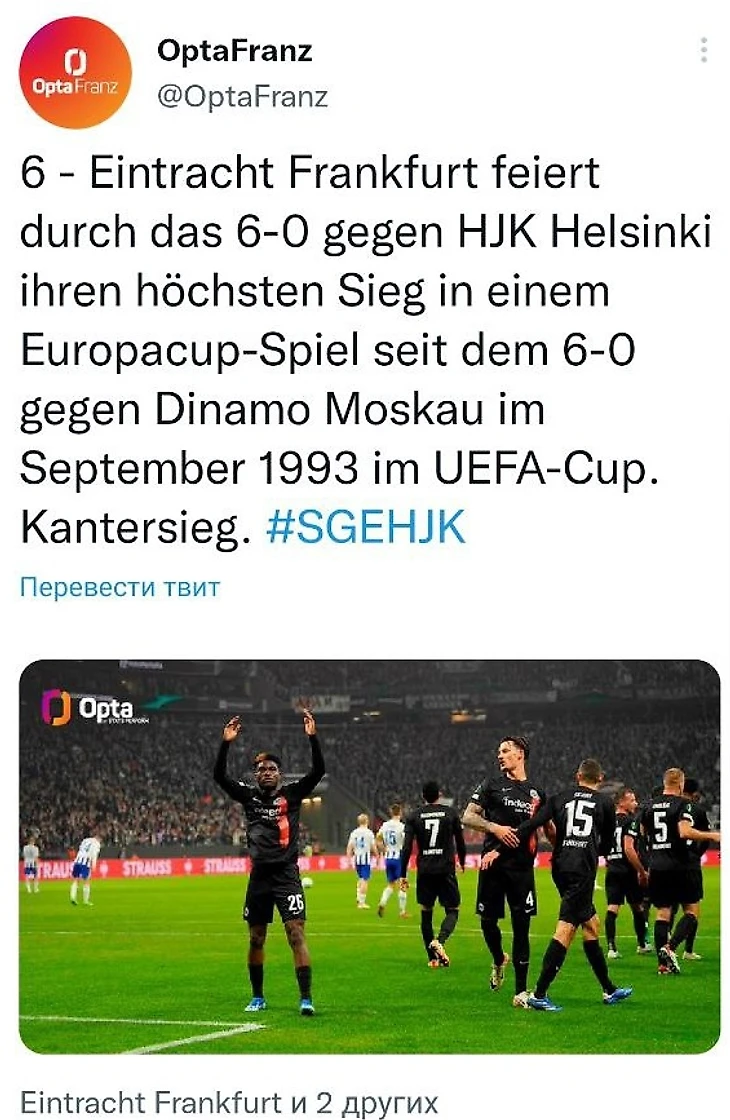 Уже к перерыву команда из немецкой Бундеслиги наколотила четыре безответных мяча в ворота финнов. После перерыва «Айнтрахт» позволял себе смелые эксперименты, тройную замену на 56-й минуте и еще два мяча, чтобы точно довести своих болельщиков до экстаза. Они уже привыкли к тому, что в родных стенах «орлы» не знают поражений и в Бундеслиге (две победы и две ничьи).