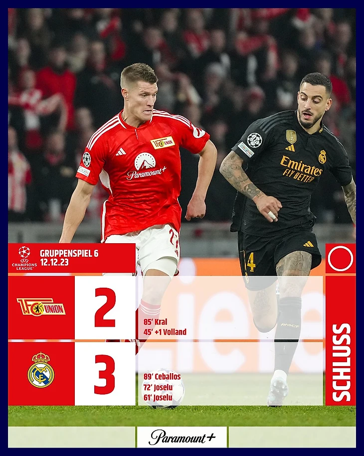 «Унион» ответил заменами, и вышедший на поле, Алекс Крал неотразимо пробил со средней дистанции в дальний нижний угол! Счёт снова сравнялся, но, увы, победить, и даже удержать ничью, «Униону» в этот вечер было не суждено. На 89-й минуте Беллингем записал на свой счёт результативную передачу, а Себальос – победный гол! Шесть из шести выбивает «Реал» в группе, ну, а «Унион» вкусил Лигу чемпионов и теперь переключается на дела в бундеслиге. А там есть, чем заняться!