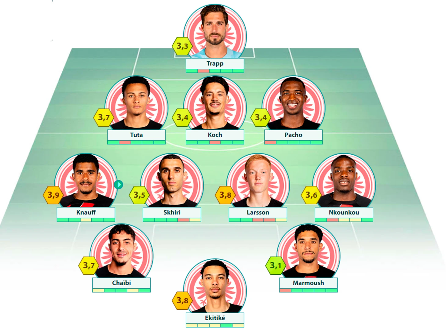 «Айнтрахт» Франкфурт: Trapp (c) - Tuta, Koch, Pacho - Buta, Larsson, Skhiri, Nkounkou - Götze, Chaïbi - Marmoush