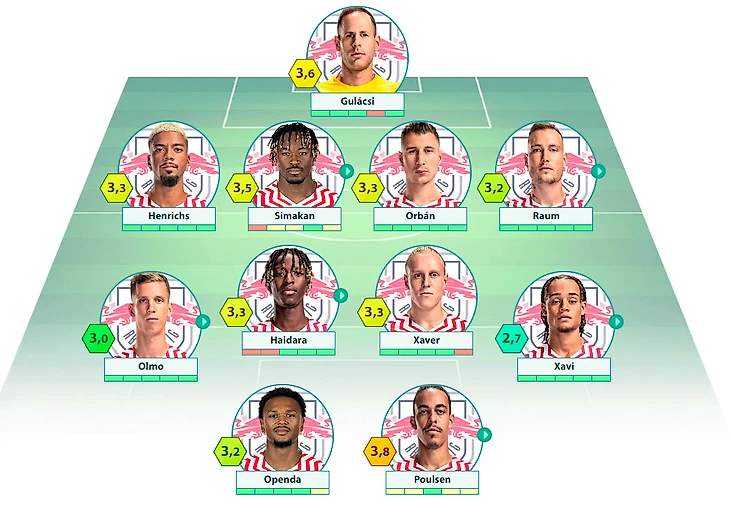 «РБ Лейпциг»: Gulácsi - Henrichs, Simakan, Orban (c), Raum - Xavi, Haidara, Schlager, Olmo - Šeško, Openda