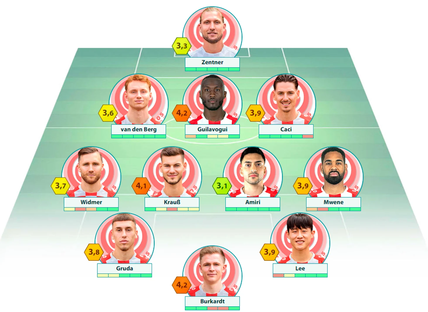 «Майнц 05»: Zentner - van den Berg, Guilavogui, Caci - Widmer (c), Krauß, Amiri, Mwene - Gruda, Burkardt, Lee