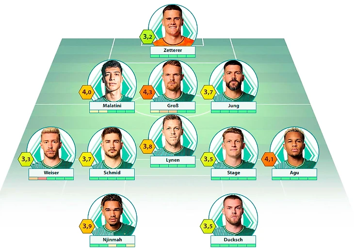 «Вердер» Бремен: Zetterer - Malatini, Groß, Jung - Lynen - Weiser, Schmid, Stage, Agu - Njinmah, Ducksch (c)