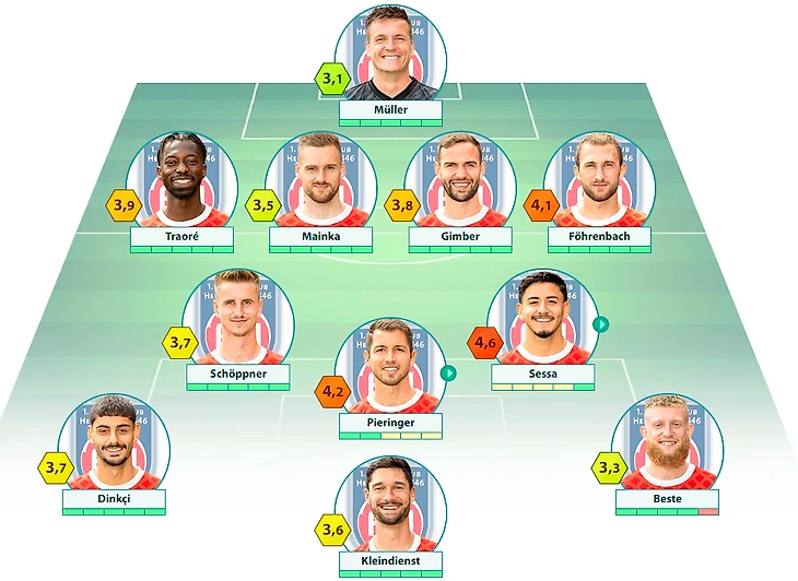 «Хайденхайм 1846»: Müller - Busch, Mainka (c), Gimber, Föhrenbach - Sessa, Schöppner - Traoré, Dovedan, Dinkçi - Kleindienst