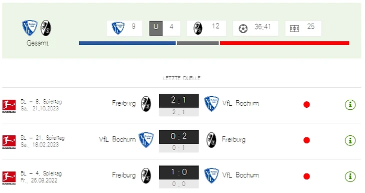 Включая четвертьфинал Кубка Германии 2021/22, Команда Штрайха выиграла пять последних официальных игр против «Бохума». Последняя победа «Бохума» над «Фрайбургом» датируется ноябрем 2021 года, когда «рурские» выиграли дома со счетом 2:1.