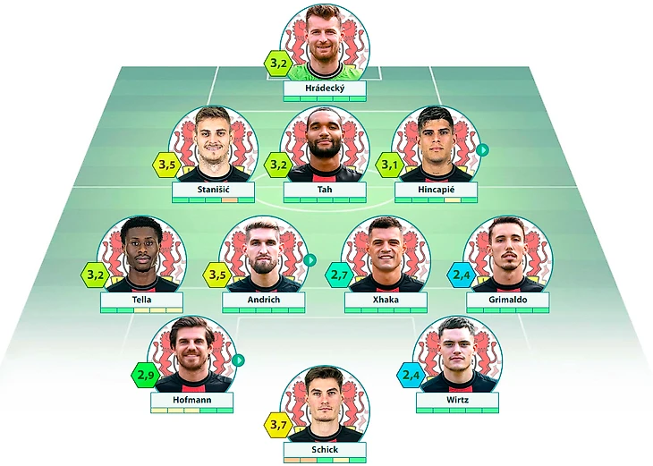«Байер» Леверкузен: Hrádecký (c) - Kossounou, Tah, Hincapié - Tella, Palacios, Xhaka, Grimaldo - Hofmann, Wirtz - Schick