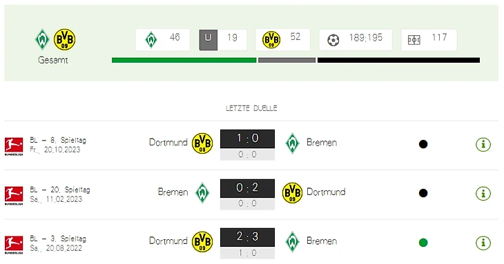 «Вердер Бремен» проиграл пять из шести последних поединков Бундеслиги против «Боруссии» Дортмунд, за исключением исторической выездной победы со счетом 3:2 в первой половине сезона 2022/23 («Дортмунд» вел со счетом 2:0 до 89-й минуты).