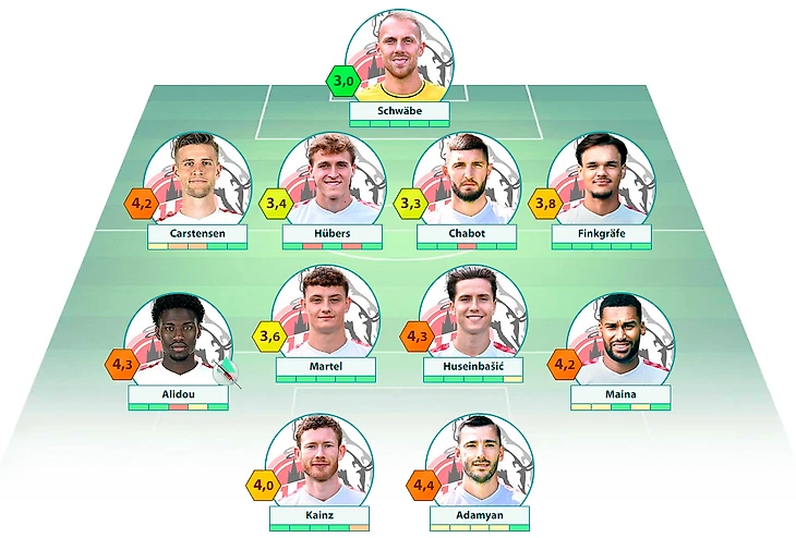 «Кёльн»: Schwäbe - Carstensen, Hübers, Chabot, Finkgräfe - Martel, Huseinbašić - Alidou, Kainz (c), Maina - Adamyan