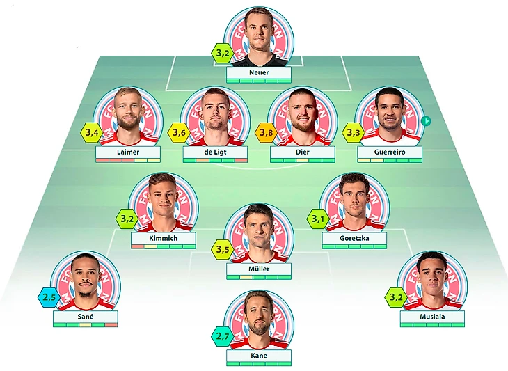 «Бавария» Мюнхен: Neuer (c) - Laimer, De Ligt, Kim, Davies - Kimmich, Goretzka - Sané, Müller, Musiala - Kane