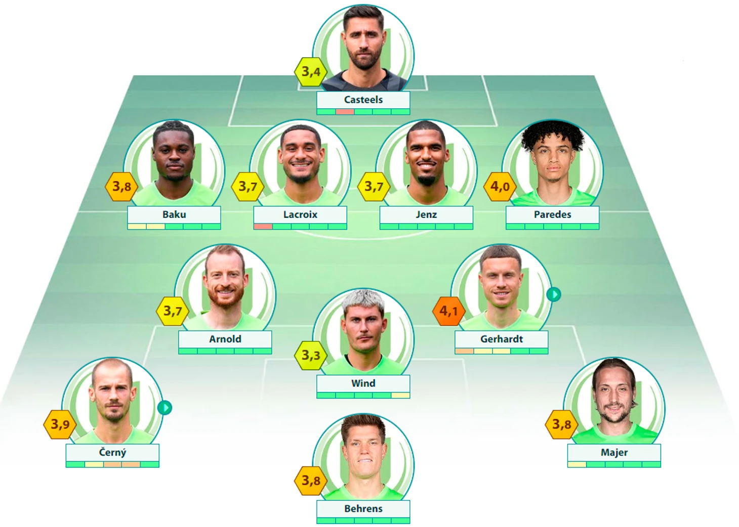 «Вольфсбург»: Casteels - Baku, Lacroix, Jenz, Fischer - Gerhardt, Arnold (c) - Majer, Wind, Paredes - Behrens
