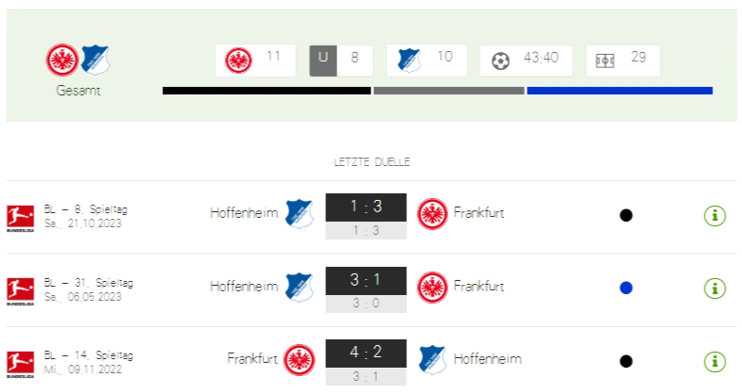 В шести последних поединках между «Франкфуртом» и «Хоффенхаймом» было забито 27 голов, всегда не менее четырех за игру (с точки зрения «орлов»: 3:1, 2:3, 2:2, 4:2, 1:3 и 3:1).