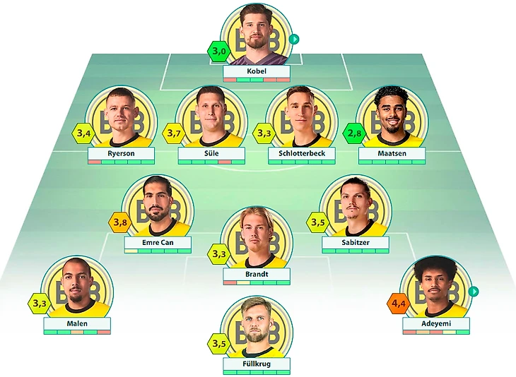«Боруссия» Дортмунд: Kobel - Ryerson, Süle, Schlotterbeck, Maatsen - Sabitzer, Can (c) – Malen, Brandt, Adeyemi - Füllkrug