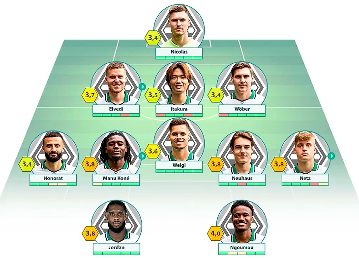 «Боруссия» Менхенгладбах: Nicolas - Elvedi, Itakura, Wöber - Honorat, Reitz, Weigl (c), Koné, Netz - Jordan, Ngoumou