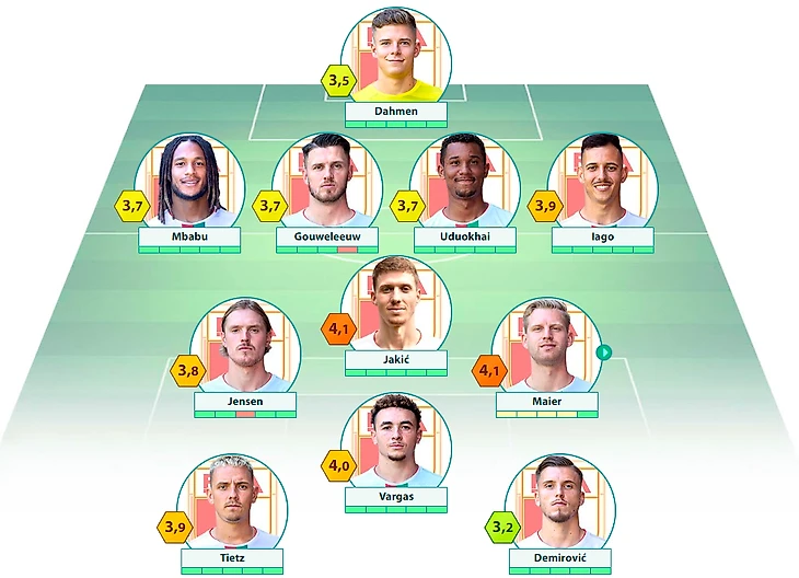 «Аугсбург»: Dahmen - Mbabu, Gouweleeuw, Uduokhai, Iago - Jensen, Jakić, Maier - Vargas - Tietz, Demirović (c)