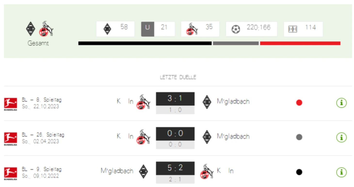 «Боруссия» Менхенгладбах одержала столько же побед в Бундеслиге над любым другим клубом, сколько над «Кёльном» (52), и больше всего голов забила «Кёльну» (189).