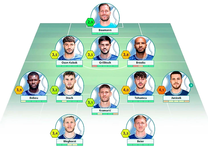 «Хоффенхайм»: Baumann (c) - Kabak, Grillitsch, Brooks - Bebou, Stach, Tohumcu, Jurásek - Kramarić - Weghorst, Beier