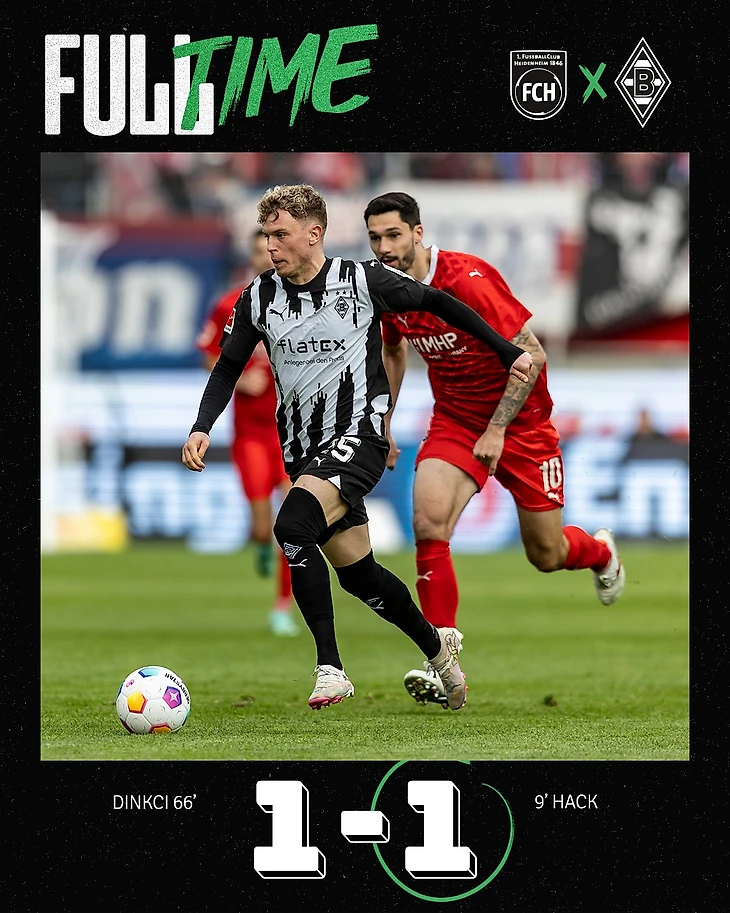 Робин Хак, который летом стоил Гладбаху ровно в 100 раз меньше Кейна, забил свой 4-й гол за неделю. Робин оформил дубль в ворота «Кёльна» за 3 минуты поле выхода на замену, забил на 8-й минуте «Саарбрюкену» в кубке посреди недели, а сегодня ему понадобилось 9 минут, чтобы открыть счёт на «Фойт Арене». Но во второй половине реактивный Динкчи сравнял, не позволив «Боруссии» обогнать «Хайденхайм». Впрочем, это не критично, ведь вылет ни одной из сторон всерьёз не грозит.