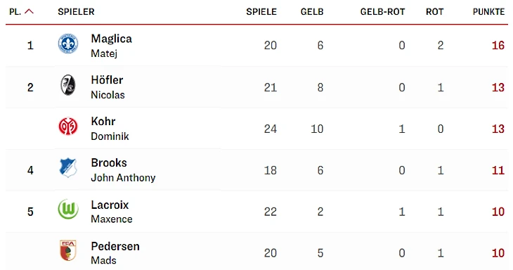 *игрок – кол-во игр – желтые – 1+1 желтые – красные – всего