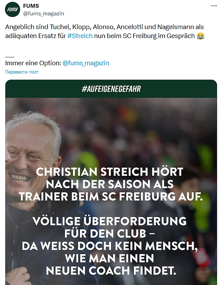 Судя по всему, Тухель, Клопп, Алонсо, Анчелотти и Нагельсманн сейчас обсуждаются во Фрайбурге как подходящие замены для #Streich