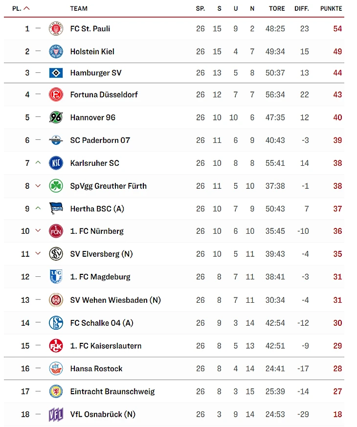 Таблица второй Бундеслиги после 26-го тура, чтобы присмотреться к тем, кто может выйти в элитный немецкий дивизион в следующем сезоне. «Санкт-Паули» мчится к повышению в классе, «Хольштайн» Киль может впервые в истории попасть в первую Бундеслигу, а «Гамбург»...пока идет на третьем месте.