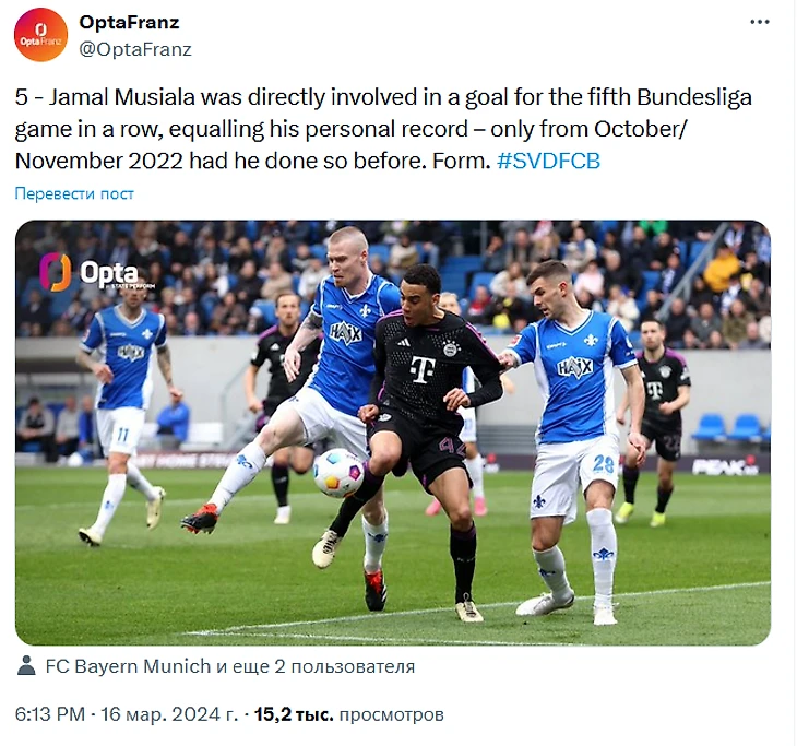 5 – Джамал Мусиала был непосредственно причастен к голу в пятом матче Бундеслиги подряд – повторил личный рекорд, который установил в октябре/ноябре 2022 года. Форма.