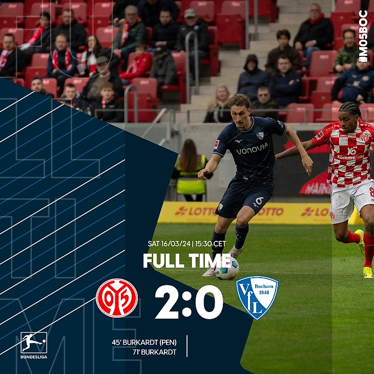 Наконец победил Майнц, который, казалось, навсегда погряз на дне турнирной таблицы. Жертвой «карнавальщиков» стал Бохум, который проиграл уже третий раз подряд. Героем встречи стал Буркардт, забивший по голу в каждом из таймов.