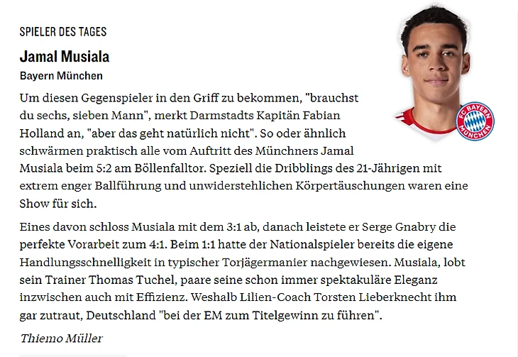 Во втором тайме Мусиала сверкал так, что затмил всех, включая Харри и весь «Дармштадт». Удвоил перевес, единолично разобравшись со своей обороной соперника как во дворе. Сам сделал гол для Гнабри, ассистировав Сержу на очередной мяч с лавки. Едва не забил ещё один шедевр, тонко перекинув вратаря, но мяч приняла перекладина. В том же эпизоде случилась неприятность с Кейном, который получил небольшое повреждение, пытаясь добить мяч в пустые ворота. Напоследок в компенсированное время свой 10-й в Бунделиге провёл Матис Тель, а Вильхельмссон комичным образом провёл мяч престижа.