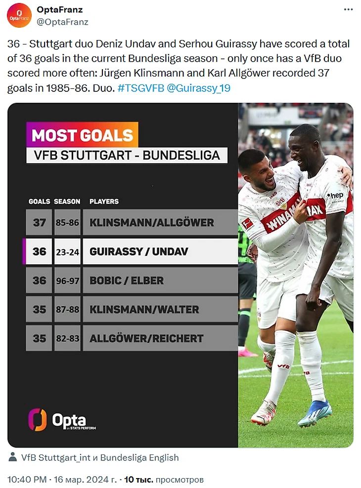 36 - Дуэт "Штутгарта" Дениза Ундава и Серу Гираси забил в общей сложности 36 голов в текущем сезоне Бундеслиги - только один раз дуэт "швабов" забил больше голов: в сезоне 1985/86 Юрген Клинсманн и Карл Аллгёвер забили 37 голов. Дуэт.