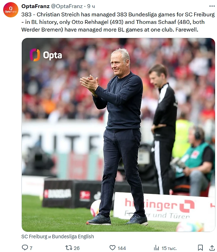 383 – Кристиан Штрайх провел 383 матча Бундеслиги в качестве тренера «Фрайбург» – в истории БЛ только Отто Рехагель (493) и Томас Шааф (480, оба «Вердер» Бремен) провели больше матчей БЛ за один клуб. Прощание.
