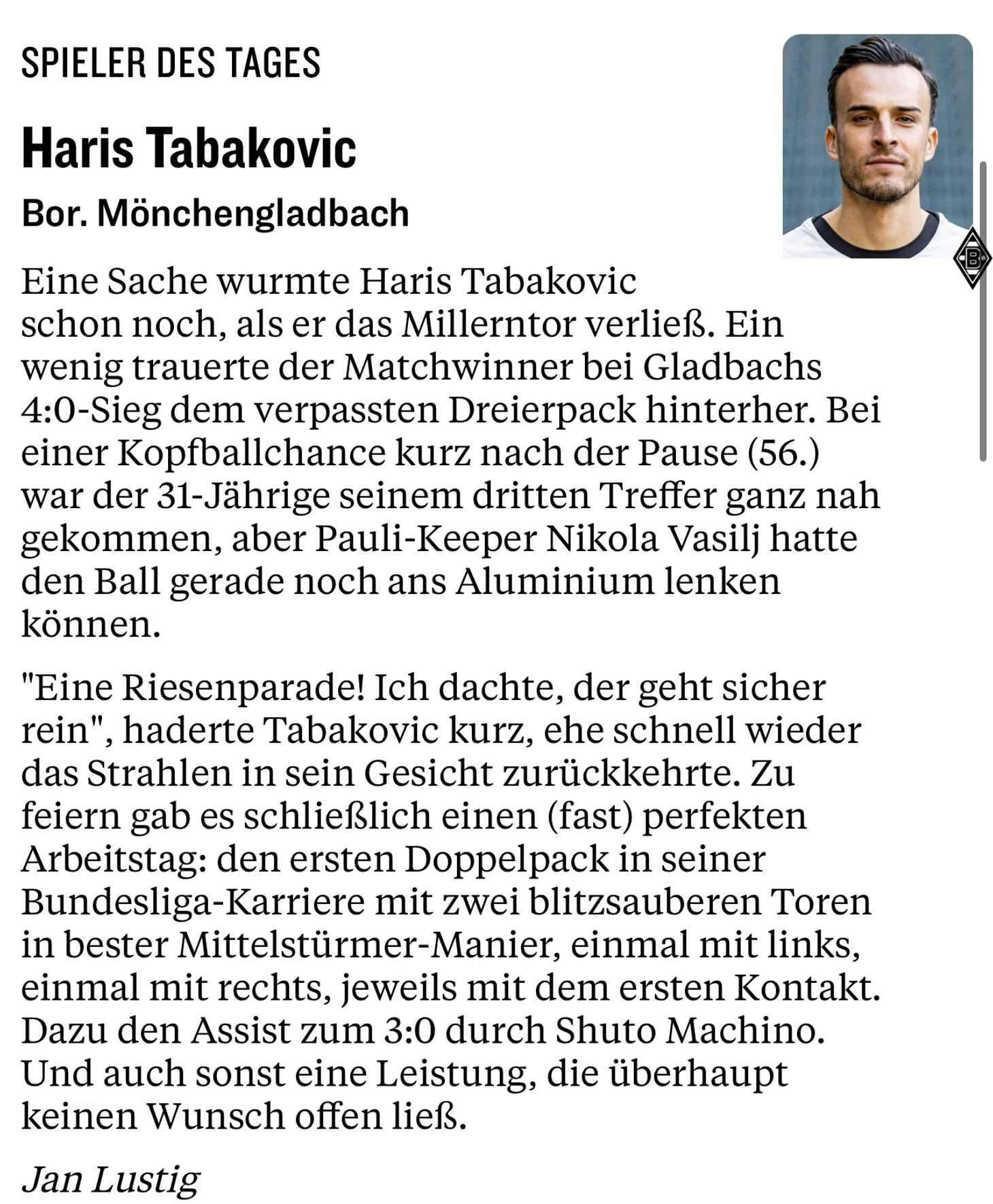 Праздник Гладбаха начался с выноса «Санкт-Паули» в девятом туре Бундеслиги – уверенные 4:0 в Гамбурге. Главным героем встречи стал Табакович, оформивший 2+1 по «гол+пас», в отсутствие травмированного Кляйндинста Харис стал главной атакующей мощью «жеребят».