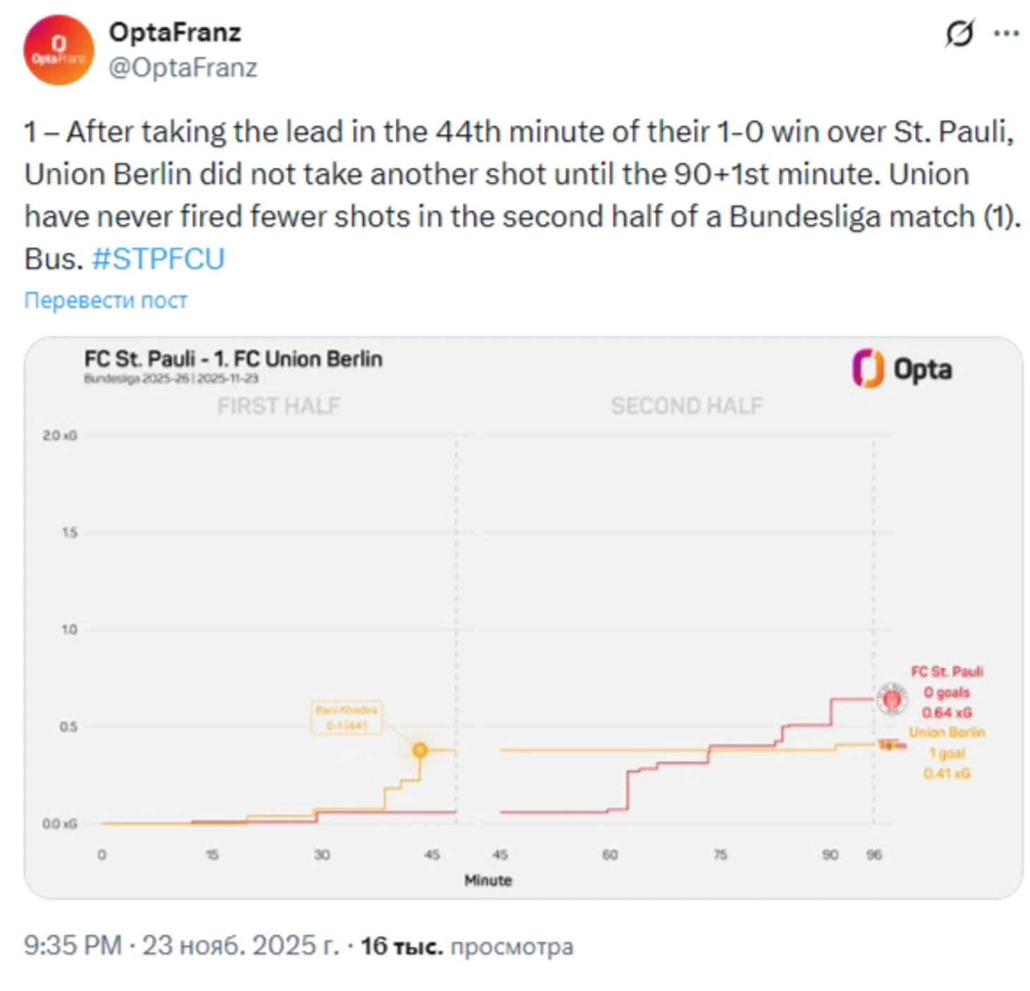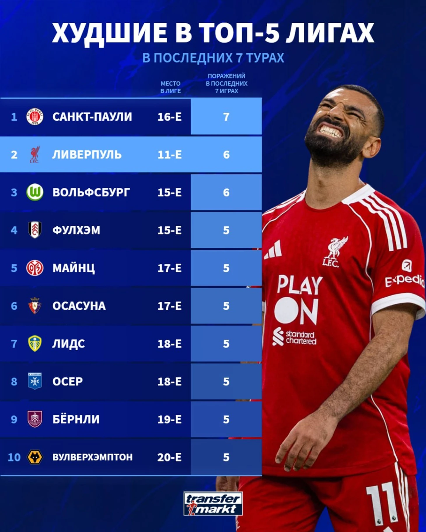 Зато после матча с «Унионом» «пираты» отправили в копилку достижение – они обошли «Ливерпуль» в топе худших команд топ-5 лиг Европы. Только «Паули» проигрывал чаще мерсисайдцев в семи последних турах топовых европейских лиг.